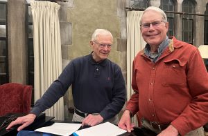 Bruce Ervin, a retired Disciples pastor now living in Boise, Idaho, came to visit DDH for dinner and the Disciples History and Thought seminar in late October. He is long-time friend of the House, and his parents, Don and Jean Ervin, were active members of University Church. Here, he and Clark Gilpin pose in the Common Room at the end of the evening.