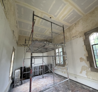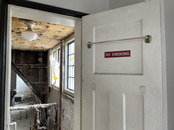 Emptying the student rooms revealed how soiled the limestone window surrounds were, so masons have been engaged to clean and repoint the stonework. They have applied cleaners, scrubbed, then rinsed with cold water, leaving behind a lovely wet, clean, stone smell each afternoon.